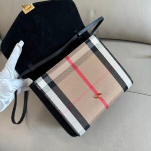 Grained leather and house check crossbody bag. The bag is designed with an open interior compartment and an outer zipper pocket for easy storage of belongings.