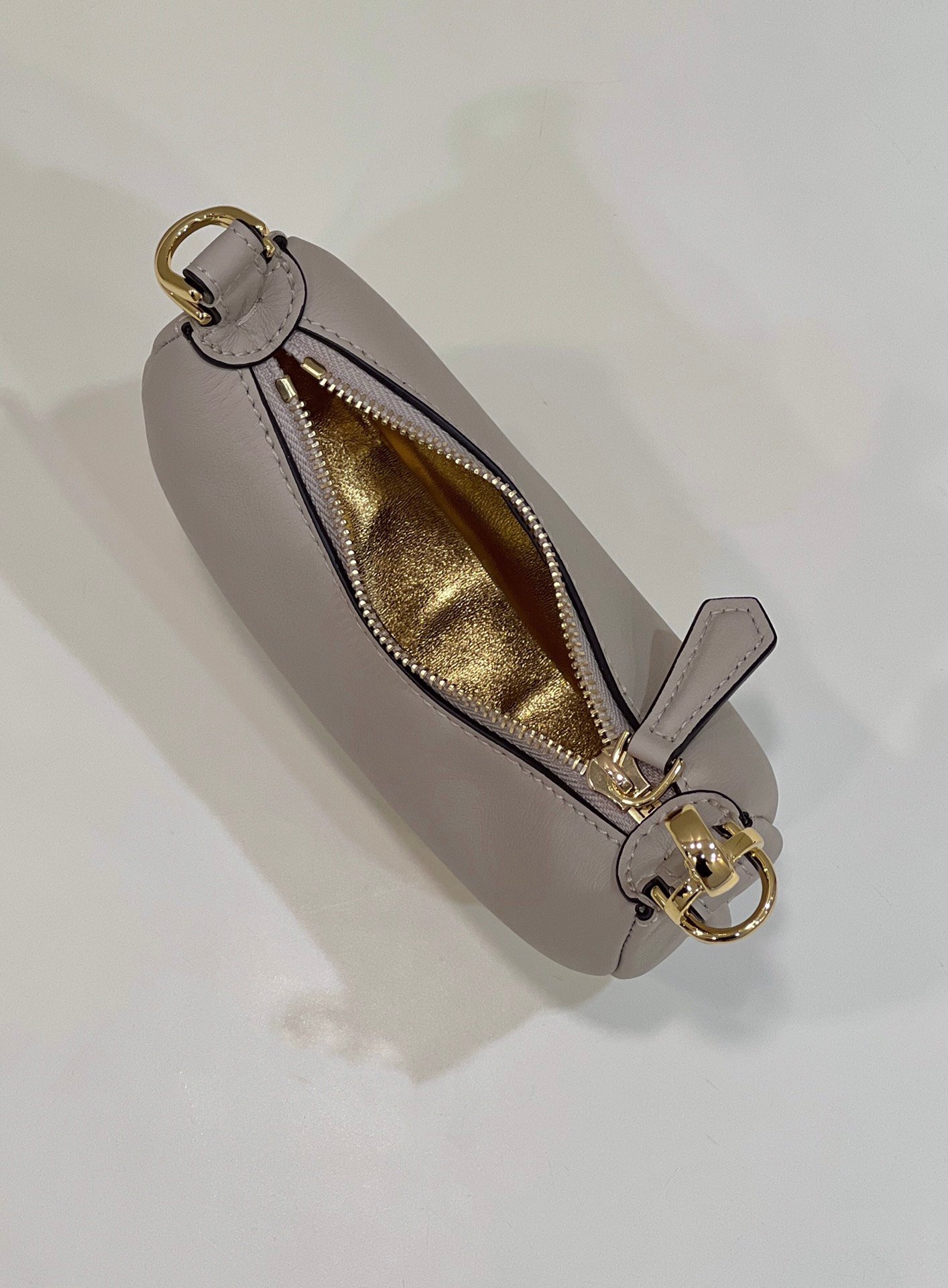 Zipper closure with fabric-lined internal compartment, gold-finish metalware.