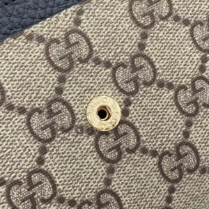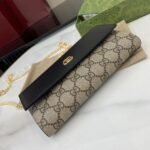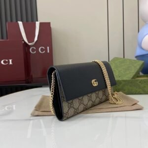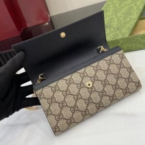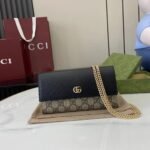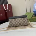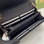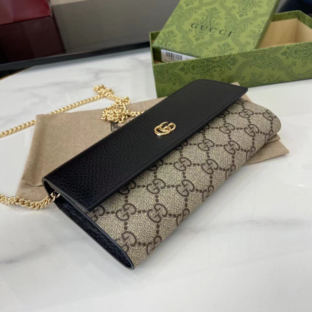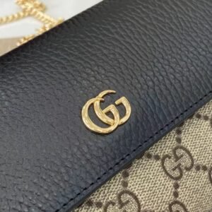 This simple, slim wallet is made of canvas with the classic G monogram and black glossy leather, with a fine chain strap. The wallet is decorated with a mini version of the GG Marmont hardware, highlighting the chic charm of the GG Marmont collection.