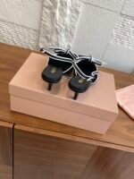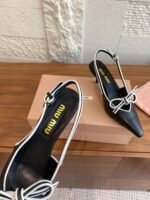 These retro miumiu closed-toe high-heeled sandals feature a small square toe and a textured, mixed-breed sheepskin edging. The bow features a signature logo. The fresh color scheme and graceful curves create an elegant and stylish look.