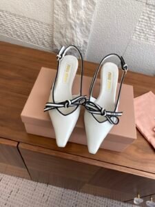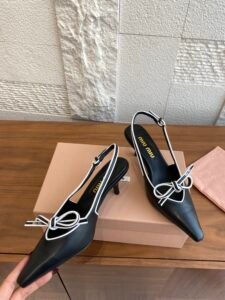 These retro miumiu closed-toe high-heeled sandals feature a small square toe and a textured, mixed-breed sheepskin edging. The bow features a signature logo. The fresh color scheme and graceful curves create an elegant and stylish look.