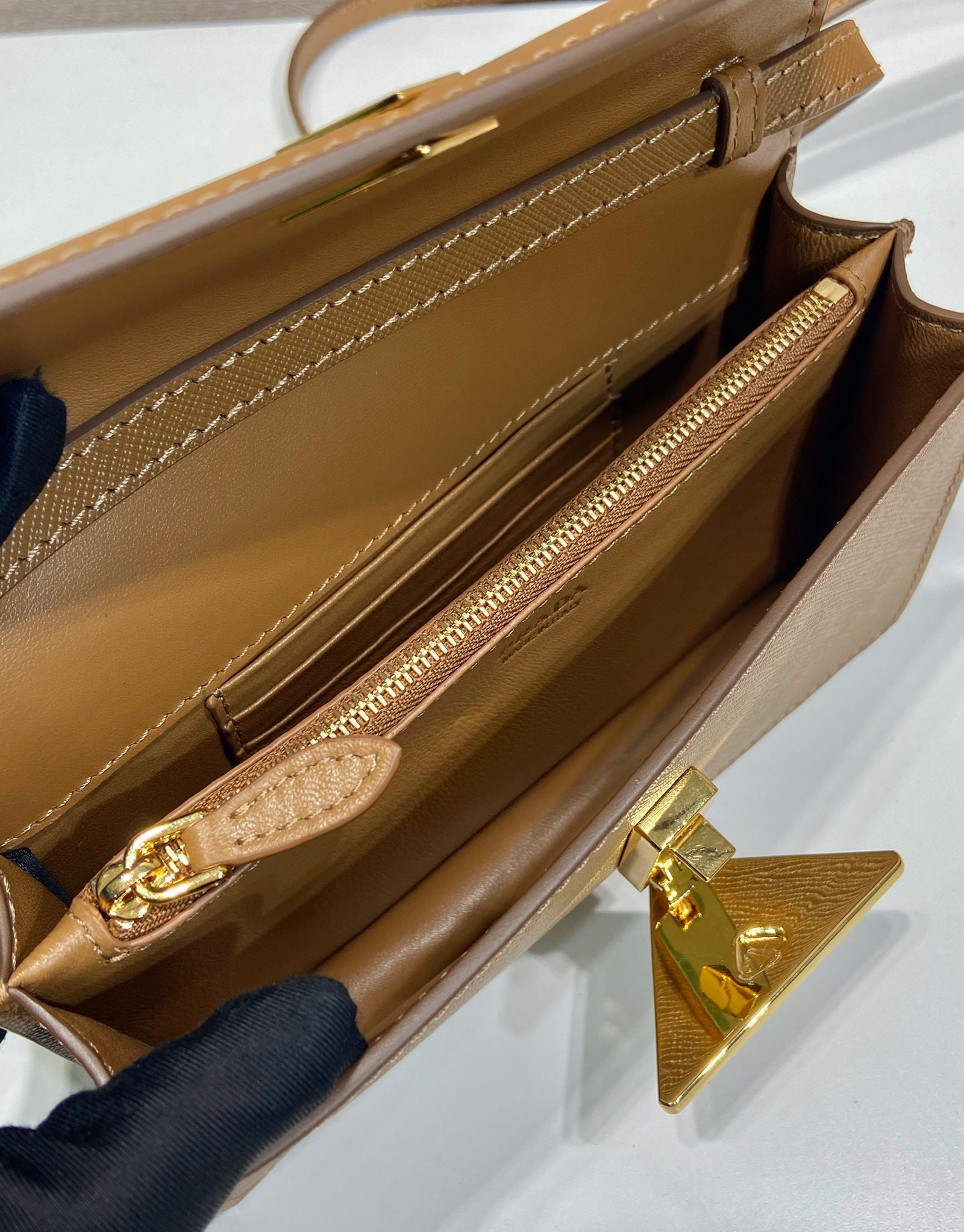 Nappa leather lining with card slots and central zipper pocket.