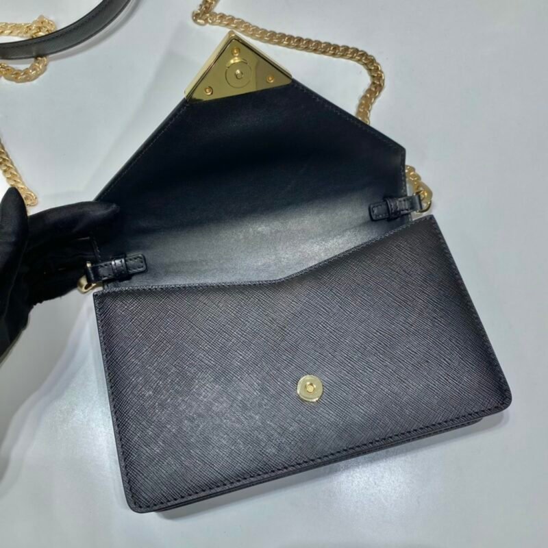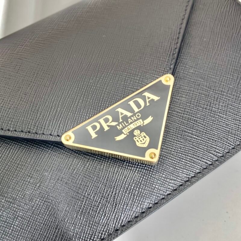 This flap shoulder bag is crafted from Saffiano leather with a lambskin interior. Its design is refined and feminine. The flap is adorned with an enameled metal triangle logo at the tip and features a detachable long shoulder strap that can also be used as a clutch.